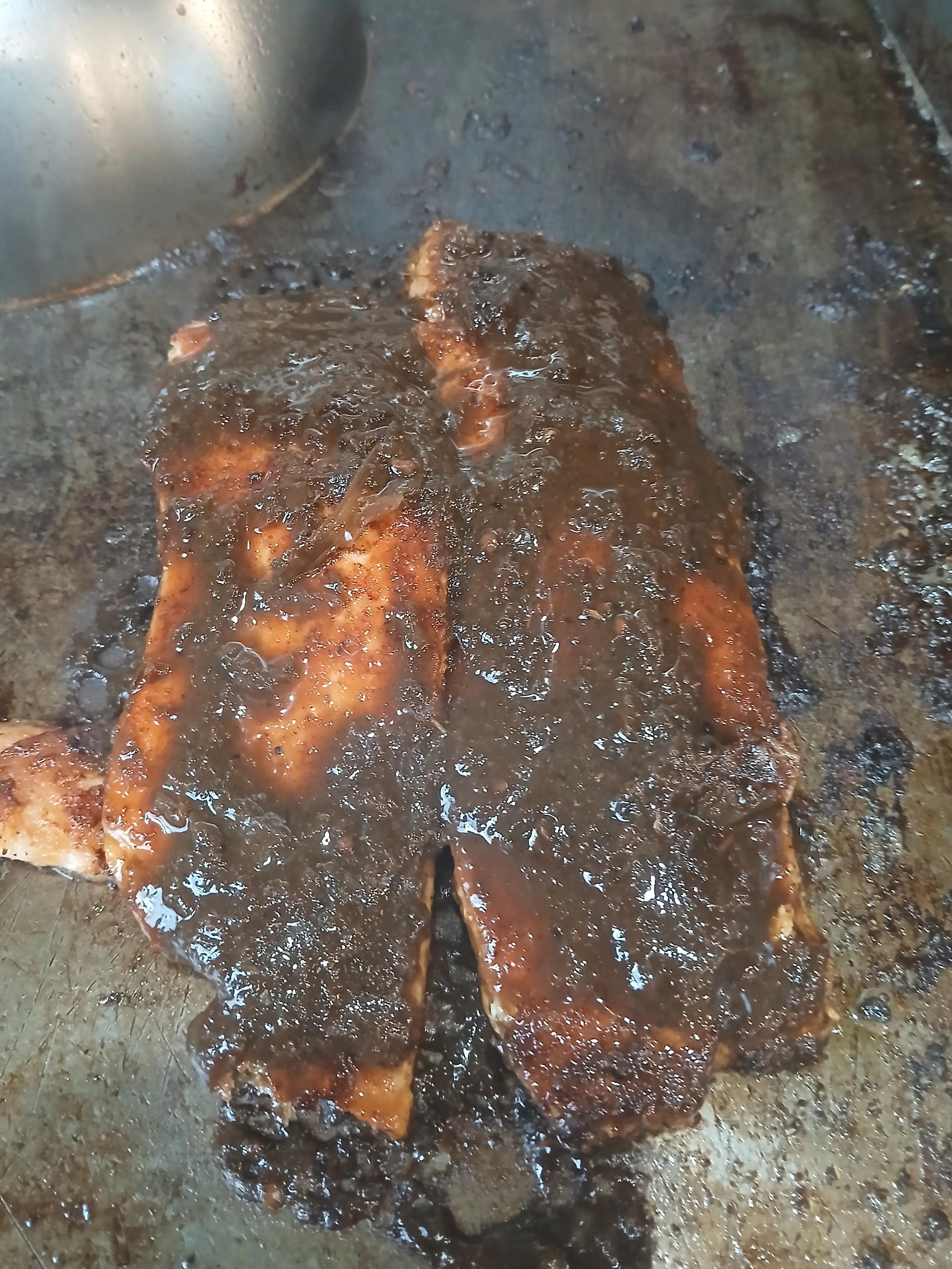 As you can see from our kitchen (as shown in your bubbling sauce photo), we use a high-performance glazing method. Instead of a long marination that can break down the texture of high-quality Atlantic salmon, we apply our signature jerk reduction live on the heat.